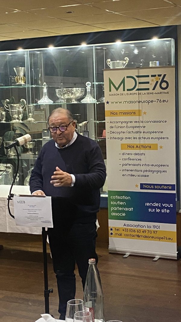 La Maison de l’Europe de la Seine-Maritime a organisé un dîner-débat sur le thème « La place des religions dans le projet européen et dans les traités » ce mercredi 26 novembre 2025 avec Monsieur Emmanuel Morucci, docteur en sociologie, conférencier pour la commission européenne, membre du Team Europe-France et Président du CECI .